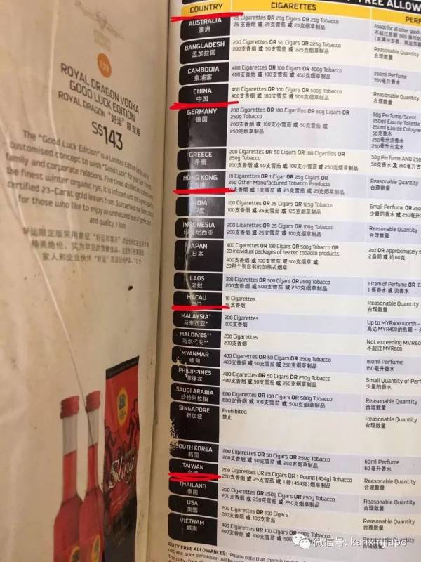 翻开杂志,里面有关各国家/地区的免税品限额一页,在“country”一栏下,写着Hong Kong(香港)、Macau(澳门)以及Taiwan(台湾)。