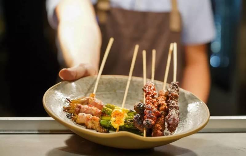 晚上,Kuro就变身成一间时尚的居酒屋,有各式烤串,烤三文鱼和肉类。最有名的大概是烤猪下颚了,选自黑猪肉,用秘制配方腌制过,多汁,还带着一丝甜味。