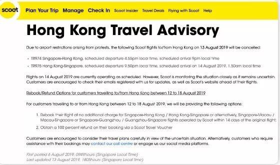由于想要退票或者改签的人数太多,新航旗下的新加坡酷航在官网发布旅行警告,为8月12日至18日来往新加坡和香港班机的乘客,提供全额退费和改期服务。