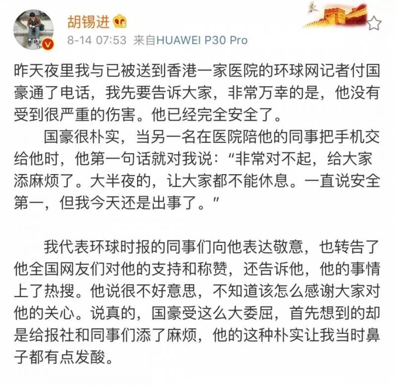 躺在担架上,头上仍旧有血渗出,这位记者仍旧保持了自己的风度。他说:“I love HongKong,谢谢,thank you。”