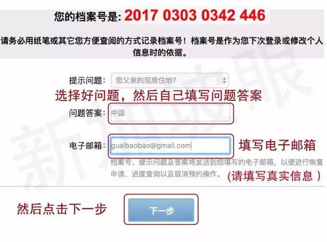 4.点完上面的“确定”键后,系统马上会跳出下面的页面。请按照图中指示选择自己的提示问题,然后填答案(建议大家放真实信息),另外电子邮件请务必填写正确,因为最后预约完成系统会发邮件到此邮箱。