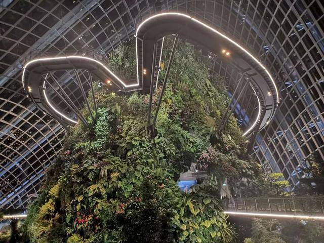 云雾林一进门就是巨大的人造瀑布,颇有气势。也是各种各样的植物遍布。转一圈继续观赏植物和审美很独特的雕塑摆设后,可以乘坐电梯到顶楼7楼。