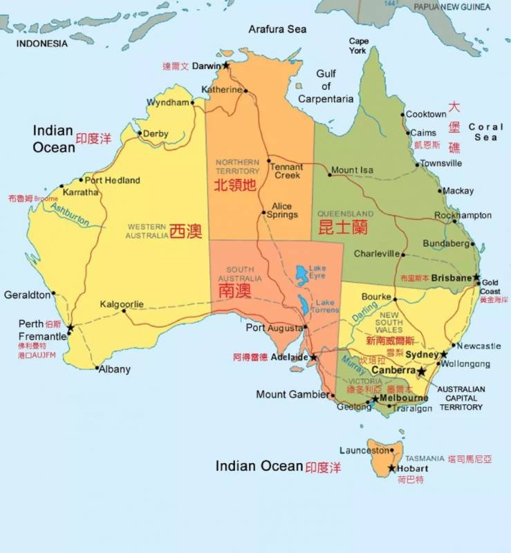 澳大利亚行政区划六个州:新南威尔士州、昆士兰州、南澳大利亚州、塔斯马尼亚、维多利亚、西澳大利亚州。其中新南威尔士州和维多利亚为较多留学生会选择的地区。