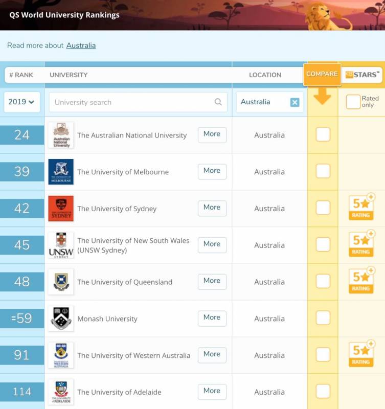 学术水平高:澳洲八大及四星大学全球排名赞!(举个栗子,浙江大学QS全球排名87,澳洲八大里排名第6的莫纳什在QS排名60)
