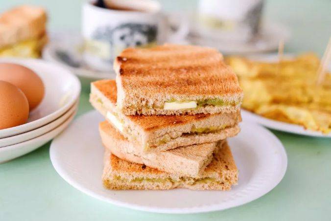 咖椰吐司+生熟蛋+咖啡的吃法可以说是南洋早餐标配。传统吐司烤至表皮酥脆,再夹上黄油和用椰浆、鸡蛋、班兰叶调制成的咖椰酱就可以食用了,香甜酥脆的滋味绝对能让你一整天都元气满满。