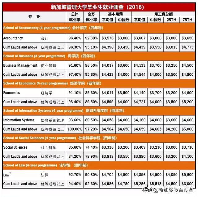 根据调查数据可以看出,新加坡国立大学起薪最高的专业就是法学,事实证明,律师确实是非常赚钱的职业;其次是耶鲁国大学院的理科学士荣誉学位,起薪4800新币,据说这个学院不好进;还有计算机类和牙科类专业,也是就业起薪高的专业代表。新加坡南洋理工大学起薪最高的专业主要包括商业与计算机,会计和业务,南洋商学院的实力果然是不一般的。新加坡管理大学起薪最高的专业也是法学的优等奖及以上,有4750新币;信息系统的优等及以上也不错,有4650新币的起薪。