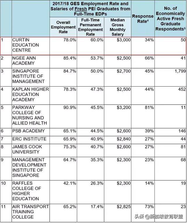 注:在所有受调查的私立院校中,新加坡科廷大学全职就业率排名第1(去年也是NO.1!),月薪中位数则以3000新币排名第2,整体就业率是排名第5!