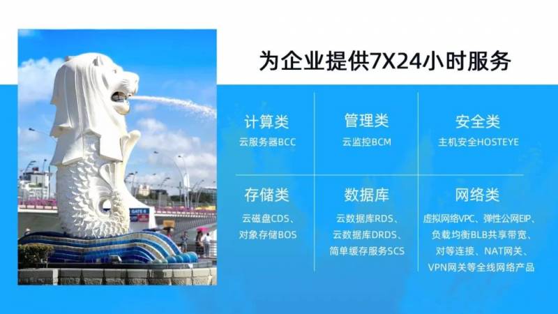 在新加坡开服一期,百度智能云支持的产品包括计算类、存储类、网络类、安全类、数据库以及管理类产品。后续,百度智能云将根据客户的需求,不断上线新的产品。