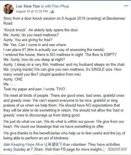 撰写上述帖文的李秀燕(译音,Lee Siew Yian, 44岁)也在自己的面簿上另外描述了免费分发床褥和枕头的具体过程。