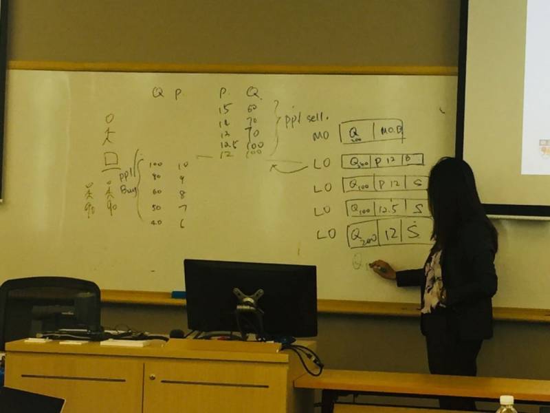 Dr Zhang Weiqi的课程带我们走进了股票和金融衍生品的市场。她在黑板上对交易过程的模拟让我们对各种不同交易方式的内部运作有了更清晰的认识。