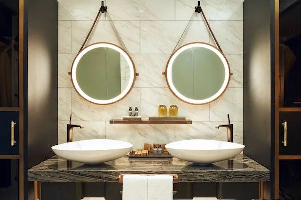 为此,房间以澳大利亚品牌Apaiser的独立浴缸为特色,它是深色的,像石头一样,与白色大理石地板形成对比。Hansgrohe的贝壳状盆是白瓷的,红色的金制配件。Iwata说,这些元素结合在一起给房间带来了一种“永恒(但)现代感”的外观。