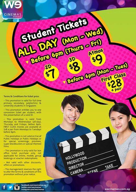Primary, Secondary & Tertiarystudents (JC, POLY, ITE, Univeristy): 观看2D电影仅需6.5 新币,观看3D电影仅需9新币