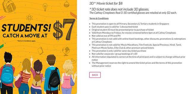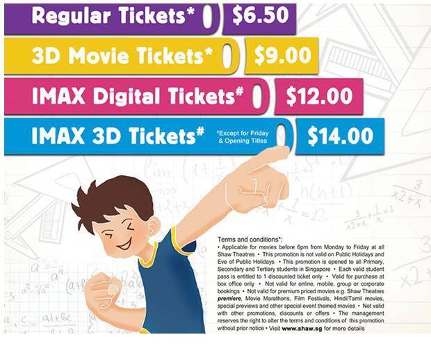 Primary, Secondary & Tertiarystudents (JC, POLY, ITE, Univeristy): 观看2D电影仅需7新币,观看3D电影仅需8新币。