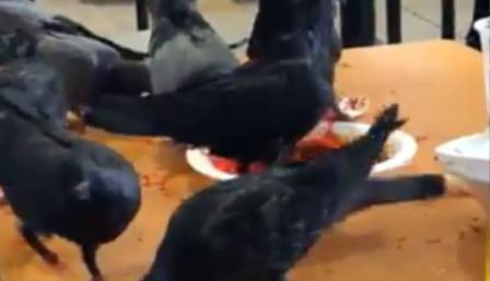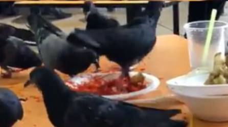 在竹脚巴刹熟食中心,网友拍到十几只鸽子和八哥纷纷“降落”,一起聚集在摆满吃剩餐盘的桌子上“抢吃”,有的在地上觅食。