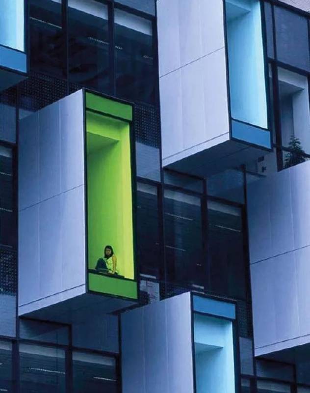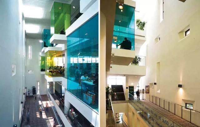 人们甫一踏入图书馆,即开始了体验之旅。竖向开敞的中庭里有连贯又舒展的Z字形坡道,同时也连接着4个楼层的阅览室。建筑内外部使用的天窗、格架结构和有色玻璃将射入室内的日光转变为多种色调,恰如阳光透过树叶洒下参差斑驳的光影,为图书馆内营造了温馨的阅读氛围。多彩的、形似吊舱的“盒子”在图书馆外部平整的立面中悬挑而出,颇有书籍从书架突出的意象;而在图书馆内部,这些“盒子”又错落有致地形成一个个独立又私密的阅读空间。“盒子”的吊舱设计源于“在树屋里居住”这一想法,在有趣又拥有绝佳视线的“盒子”里,人们可忘记生活的繁琐,静心沉寂在书籍的阅读和学习中;亦可举行小型研讨会或开展读书论坛,而不致惊扰他人;还可放飞心情,远眺大街上的车水马龙、熙来攘往。