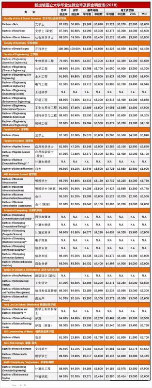 注:2018年11月,新加坡国立大学6699名全日制本科生和877名后续毕业生参加了这次调查,分别占总毕业生76.3%和68.4%;新加坡南洋理工大学 5900名2018年全日制本科生和28名后续毕业生参加了这次调查,分别占总毕业生75.9%和96.4%;新加坡管理大学1886名2017年管理大学全日制本科生和145名后续毕业生参加了这次调查,分别占总毕业生79.7% 和 77.2%。