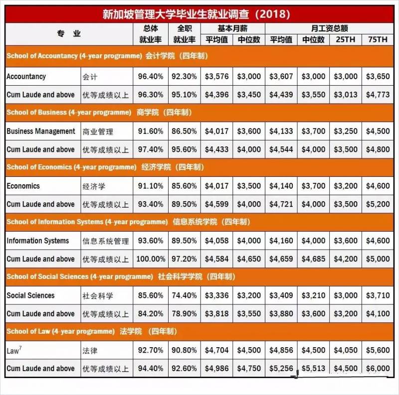 根据调查数据可以看出,新加坡国立大学起薪最高的专业就是法学,事实证明,律师确实是非常赚钱的职业;其次是耶鲁国大学院的理科学士荣誉学位,起薪4800新币,据说这个学院不好进;还有计算机类和牙科类专业,也是就业起薪高的专业代表。新加坡南洋理工大学起薪最高的专业主要包括商业与计算机,会计和业务,南洋商学院的实力果然是不一般的。新加坡管理大学起薪最高的专业也是法学的优等奖及以上,有4750新币;信息系统的优等及以上也不错,有4650新币的起薪。