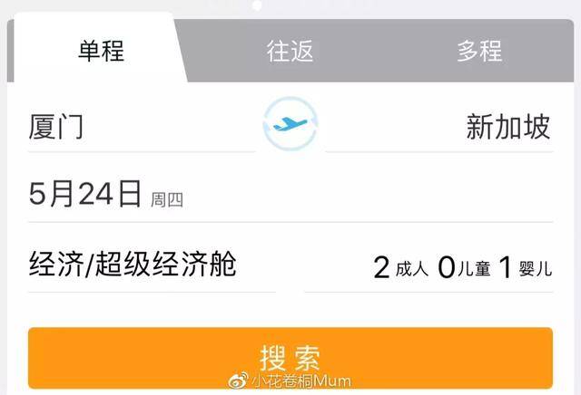 2、例如:搜索 5月24日 厦门至新加坡 2成人1婴儿 出来的价格就是人均834元,三个人就是2500,但如果是1成人的价格就要相对比套票的价格高。这是订亲子机票的小窍门,仅限于三人且不是所有日期都可以,所以要查看好出行日期再安排。