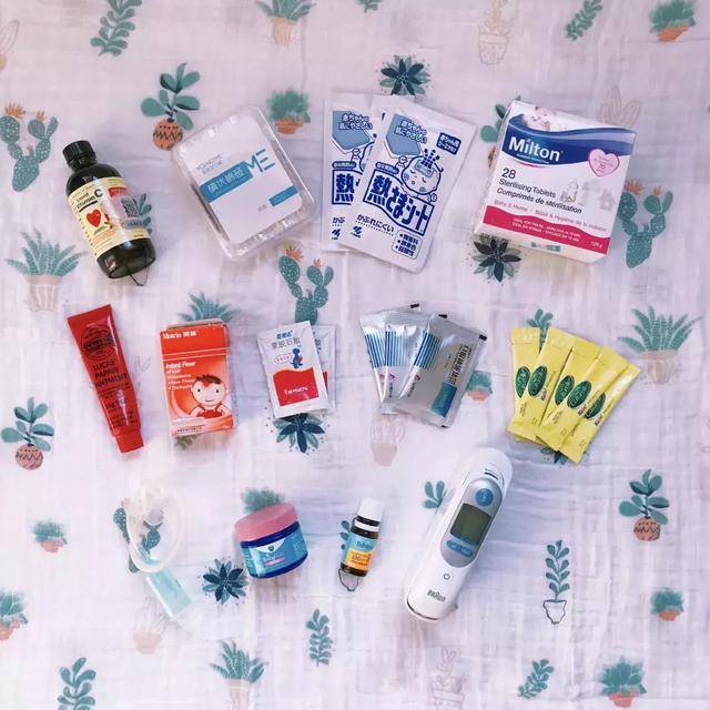 VC/碘伏棉签、退热贴、消毒片、木瓜膏、退烧药、蒙脱石散、补液盐、益生菌、吸鼻器、通鼻膏、VD、耳温枪