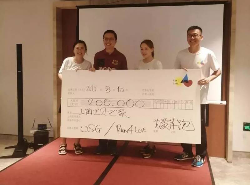 新加坡驻上海总领事罗德伟先生也在终点线为他加油,并亲自和他一起把筹集到的20万元人民币善款交给了上海宝贝之家的发起人张老师,用于为病患孤儿治疗用途。
