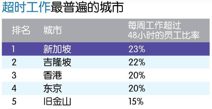 23%的新加坡全职员工更是每周工作超过48小时,这个比率在40个城市中排名第一。