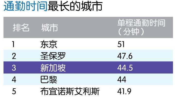 不要看新加坡国土面积这样小,平均通勤时间,单程就要44.5分钟,仅排在东京和圣保罗之后。