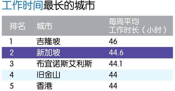 新加坡全职员工每周平均工作44.6小时,在40个城市中排名第二,仅排在吉隆坡之后。