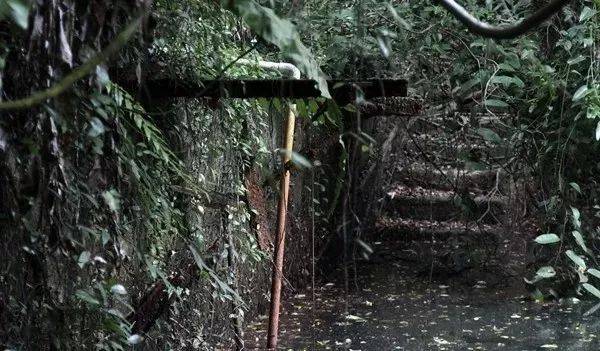 花柏山下的废弃池塘看起来像是游泳池,又像是蓄水池。据国家文物局研究员介绍,该团队在研究新加坡旧地图时发现这一带有三个蓄水池,但在80年代之后的地图却再也没有标明了。这个废弃的池塘大约有三个羽毛球场大,水面布满枯枝落叶,看起来早已经年失修。