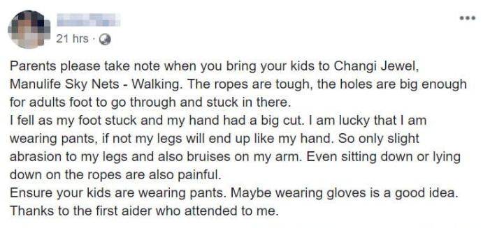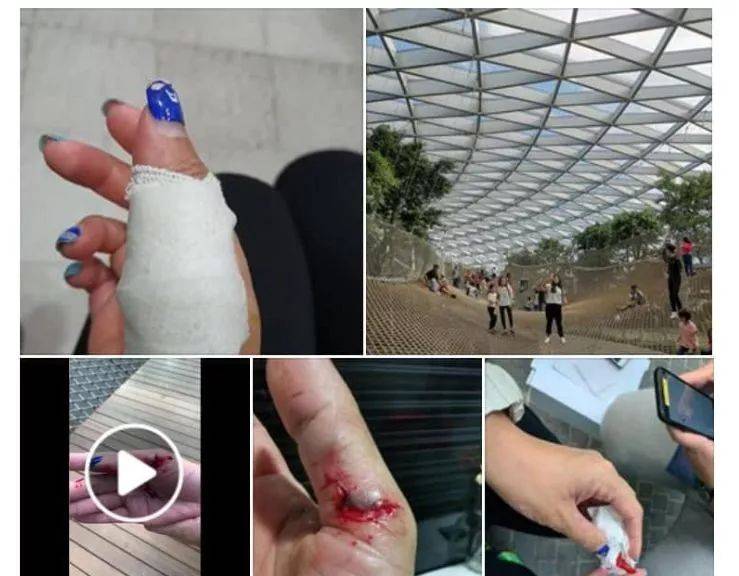 昨天(6月15日),刚刚开业5天的星耀樟宜“天空之网”突发安全事故!一名网友整只脚被卡在天行网中,失去平衡后摔倒,手指被割伤,鲜血四流.......