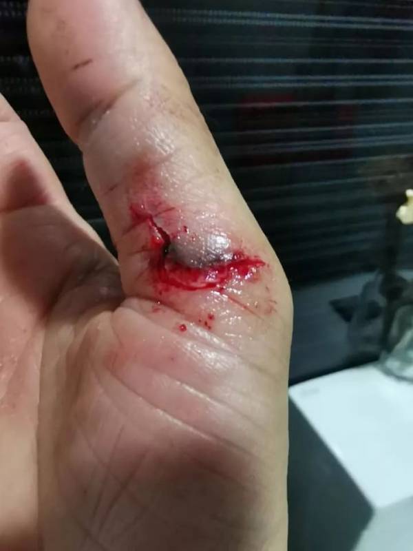 重灾区是右手大拇指,有近2厘米长较深的伤口,边缘泛起青紫色,一部分肉微微外翻。