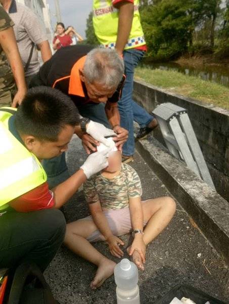(大山脚26日讯)一名母亲骑摩哆载着5岁女儿时,疑遭到掠夺,双双从摩哆上翻覆,并掉入一旁约8尺深的水沟受伤,年幼女儿更是头破血流。