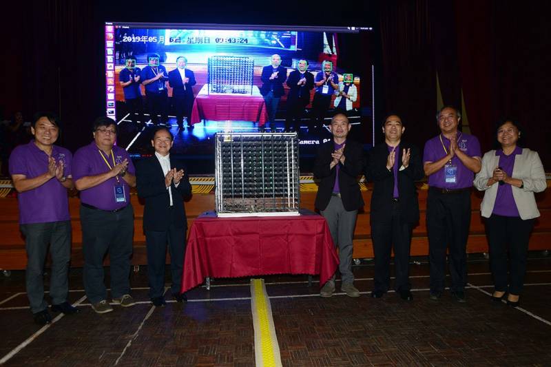 第15届马来西亚华文独中科学营使用人脸识别仪器开幕,非常特别。左起为王志强、蔡亲炀、陈大锦、林立迎、林景清、苏克伟及张梅莲。