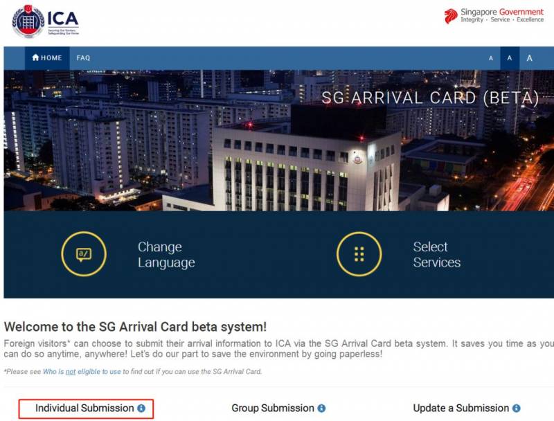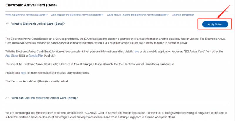 点击Electronic Arrival Card (Beta),符合条件的入境新加坡旅客(工作准证持有者和邮轮乘客不适用)都可以在线填写电子白卡;