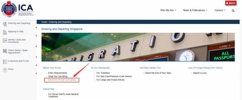 打开https://www.ica.gov.sg/,点击Enterning and Departing;