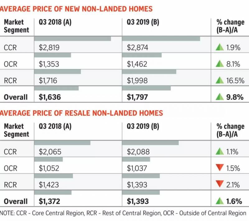 相比之下,今年第三季整体二手房价同比仅上涨1.6%。由于这几个月新楼盘的推出加剧了市场竞争,中部核心地区(CCR)的房价上涨1.1%,但中部以外地区的价格下跌了1.5%,RCR价格下跌了2.1%。