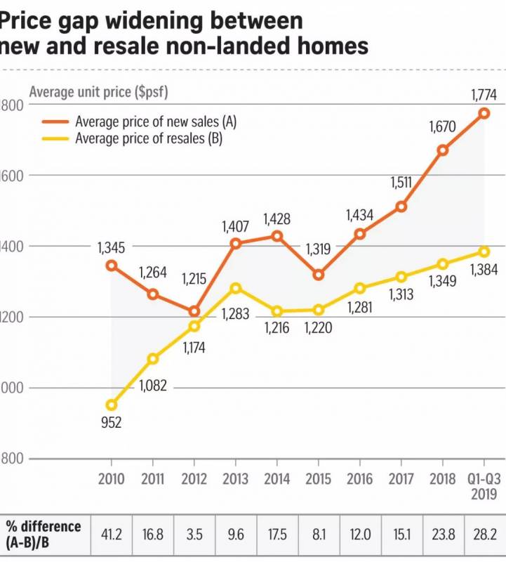 报告中显示,更突显这个趋势的是,今年前三个季度,非拥有土地的私人住宅项目平均房价比转售价格高出28.2%,而去年的两项的差距为23.8%,2017年的差距是15.1%。