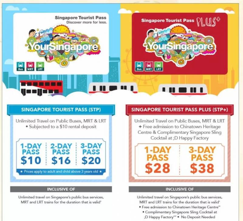专门为游客设计的通行卡,分为一日卡(S$10)、两日卡(S$16 )和三日卡(S$20),每卡需外加押金S$10 。持游客通行卡就可不限次数搭乘新加坡地铁(MRT)、轻轨(LRT)及巴士等大众交通工具。