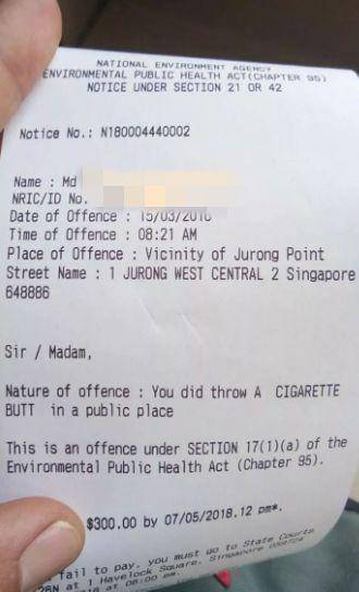 丢烟头罚款300新币的罚单