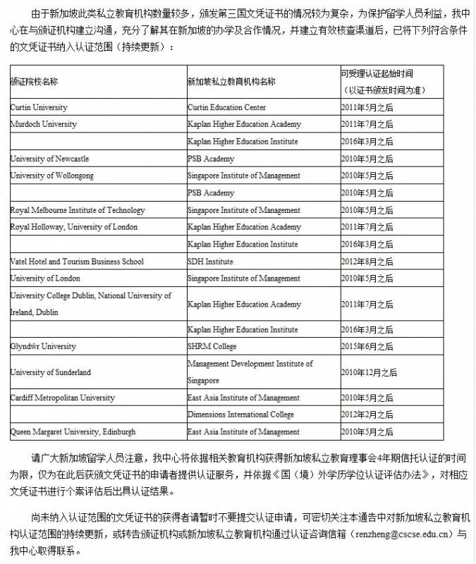 随着新加坡政府对私立教育机构立法和质量保障机制的不断完善,目前有以下五类私立教育机构的文凭证书已被中国认可: