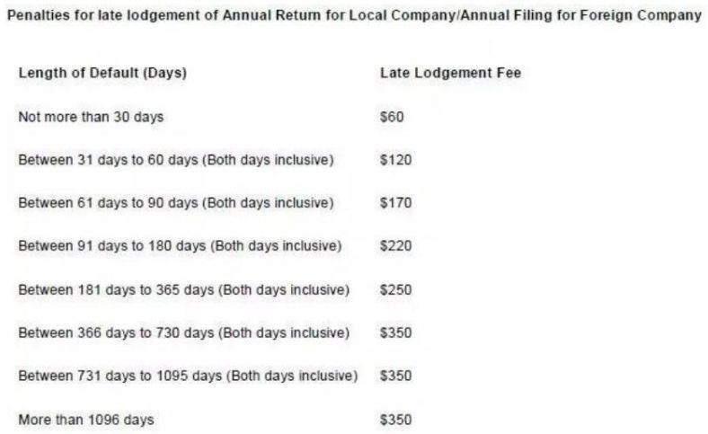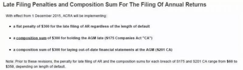 从 2015 年 12 月 1 日起, 新加坡注册局迟交罚款政策将进行调整, 凡注册的私人 有限公司到了财政年不进行年审,不及时向政府提交年度财务报表等四项材料, 将被 追加罚款 300 新币,即在原有的迟交罚款额度的基础上, 不论推迟时间长短,均再增 加 300 新币。