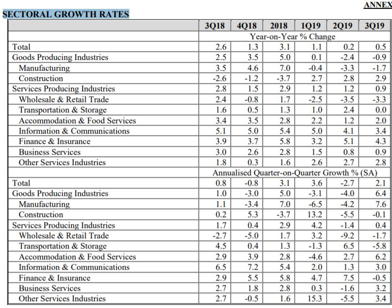 据悉,新加坡第三季度经济同比增长0.5%,比预估的0.1%和第二季度的0.2%增长更高。增长的主要功臣是建筑业和服务业,其中,建筑业在公共、私人建筑活动的带动下增长了2.9%,服务业则同比增长0.9%。
