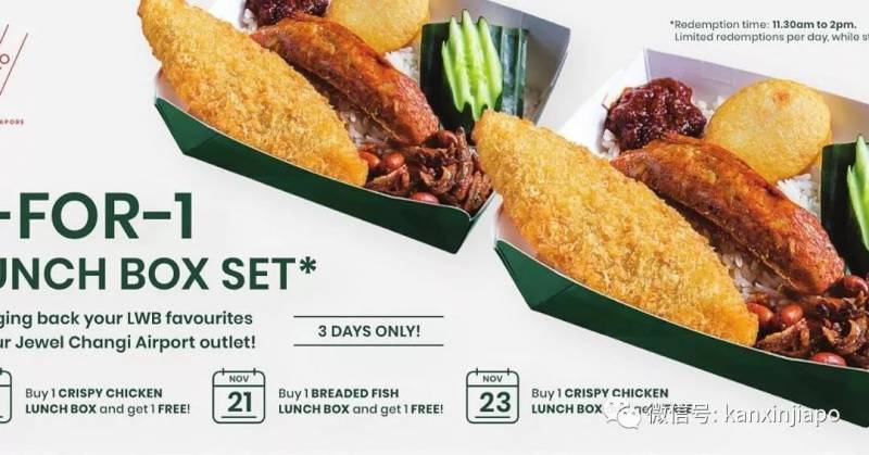 脆皮鸡肉午餐、面包碎+鱼肉午餐买一送一。