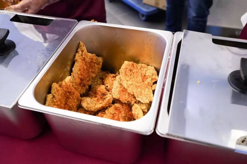大块多汁的胸肉外面裹着一层酥脆的咸面糊。