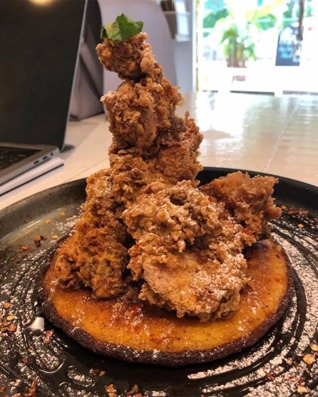 炸鸡和自制酪乳煎饼,配chilli maple sauce
