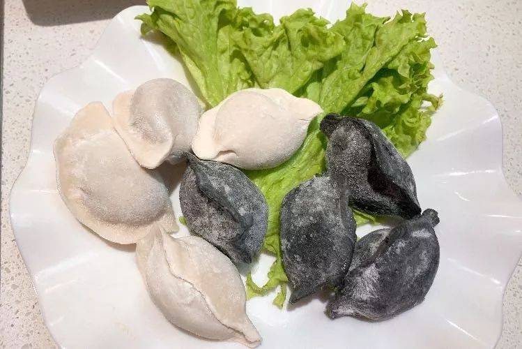 墨鱼汁韭菜猪肉水饺和白菜猪肉水饺,咬一口爆汁,必须记得给这个留地方,墨汁水饺皮可是店里自制(S$5.4墨鱼水饺 S$3.5白菜猪肉,你看到这个,是两个半份拼出来的)
