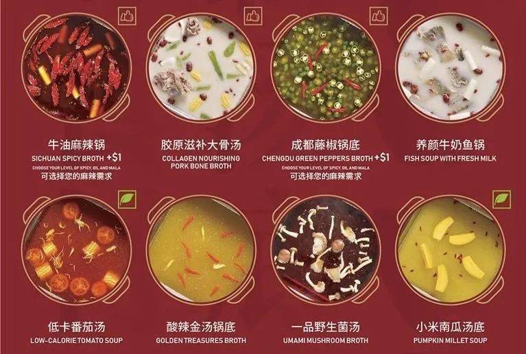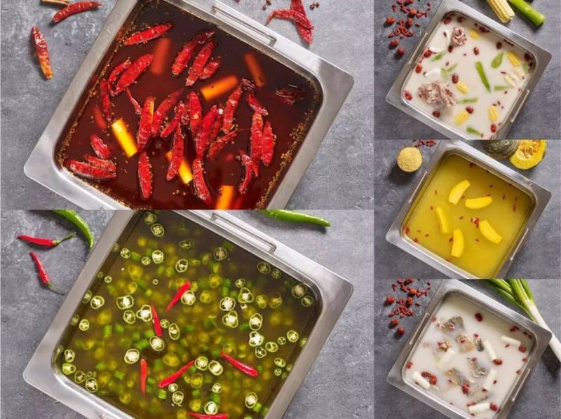 牛油麻辣锅底、成都藤椒锅底、养颜牛奶鱼汤、胶原滋补大骨汤、小米南瓜汤底,每一种汤底都精心选料。