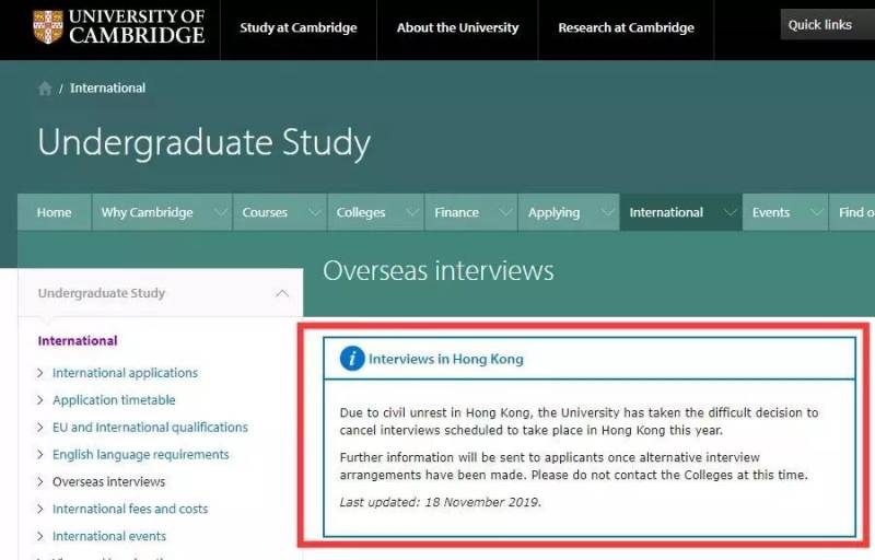 多家香港媒体报道称,英国名校剑桥大学取消了原定于今年11月29日和30日在中国香港地区举行的海外招生面试。