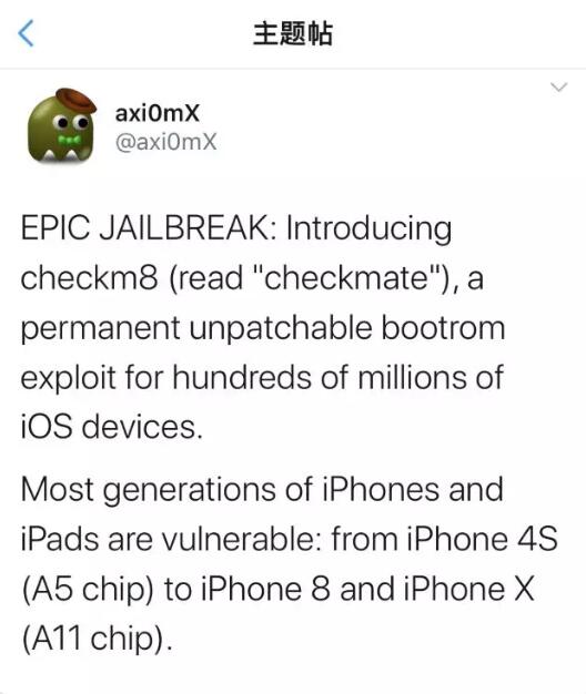 安全研究人员@axi0mX在推特上公开了这一个名为“checkm8”的iPhone硬件漏洞。