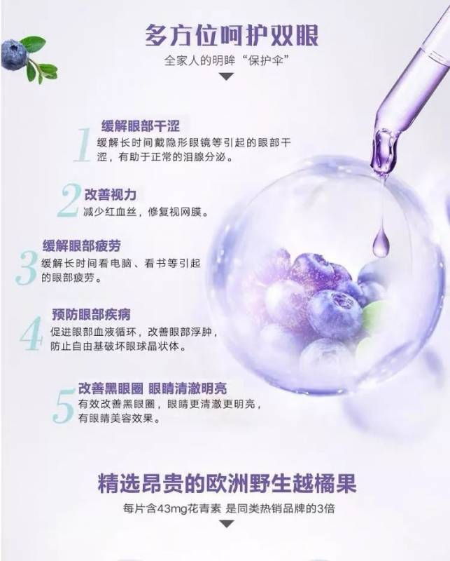 特点:选用昂贵的欧洲野生越橘果,每片含43mg花青素,是同类产品的3倍!