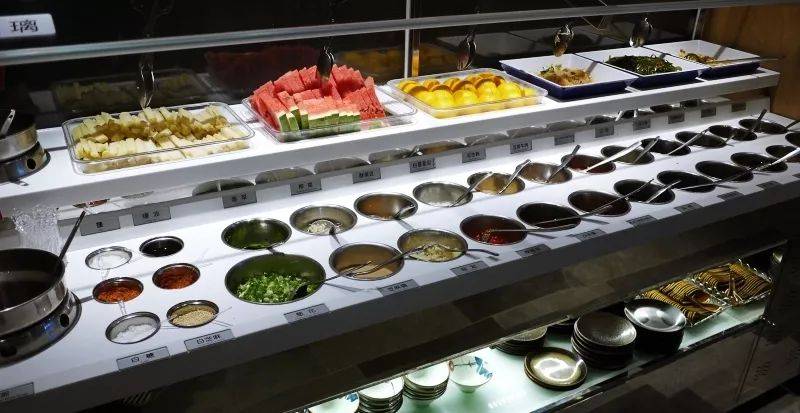“有了好锅底,怎么能缺好蘸料呢~我们为你准备了酱料丰富的蘸料台,还有鲜美水果和开胃小菜哦!”